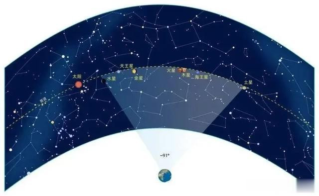 至于连珠(或联珠),就是我们所看到的夜空天象。在古代,人们说的 “五星联珠” 或 “五星聚”,并非简单的五星同现,而是要求它们在较小天空区域内靠的很近。古人已经发现,日月五星运行轨迹都在黄道附近,黄道就是太阳在恒星背景里行进的轨迹,是一个大圆。对,请注意这里黄道不是“一条直线”,在我们地球上看是一条跨越天空的弧线。唐代韦庄诗里说“但见时光流似箭,岂知天道曲如弓”,说的就是这个现象。
