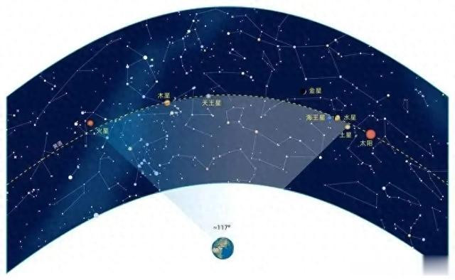 而现在网络上时常出现的“七星连珠”,定义则宽泛得多。比如 2 月 28 日即将出现的所谓 “七星连珠”,只不过是七大行星同时出现在夜空,东西跨度达 117°,跨越了大半个天空。一般来说,天王星、海王星只有在比较黑暗的环境下、借助天文望远镜才能看到,更糟糕的是当天它们非常接近太阳,观测条件并不好。好消息是,也不是只有 2 月 28 日才能看到,前后几天均可见。像这样宽泛所指“七星连珠” 三五年就会出现一次,上一次是在 2022 年 6 月中旬,观测条件也好得多。